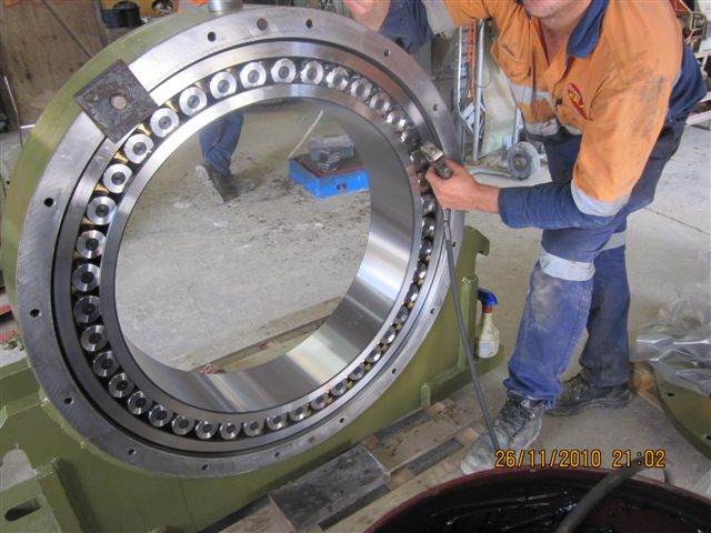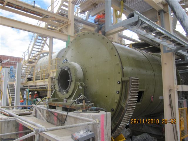 When BLA arrived on site all that was in place was the concrete foundations with centre lines marked. BLA surveyed the centerlines to make sure that they were correct, then set the subsoles to the required height. All the sole plates were installed, set on centre line and the bolts tightened. Both trunnion bearing housings were lifted into position and set on centre. The mill was lifted in, the girth gear installed and aligned, the pinion was aligned to the highest point of the gear and all remaining components of the drive were installed and aligned. The mill was commissioned without any issues. The installation was completed by the Burgess BLA crew from Townsville.