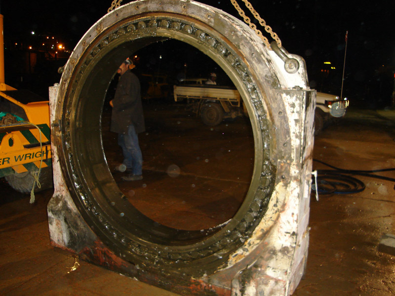 BLA arrived onsite with their fully equipment mobile workshop and commenced work on the massive 248/1800 feed end trunnion roller bearing. The cradles were installed, the mill was jacked, the bearing was removed and ready for SKF to inspect the bearing journal and housing.